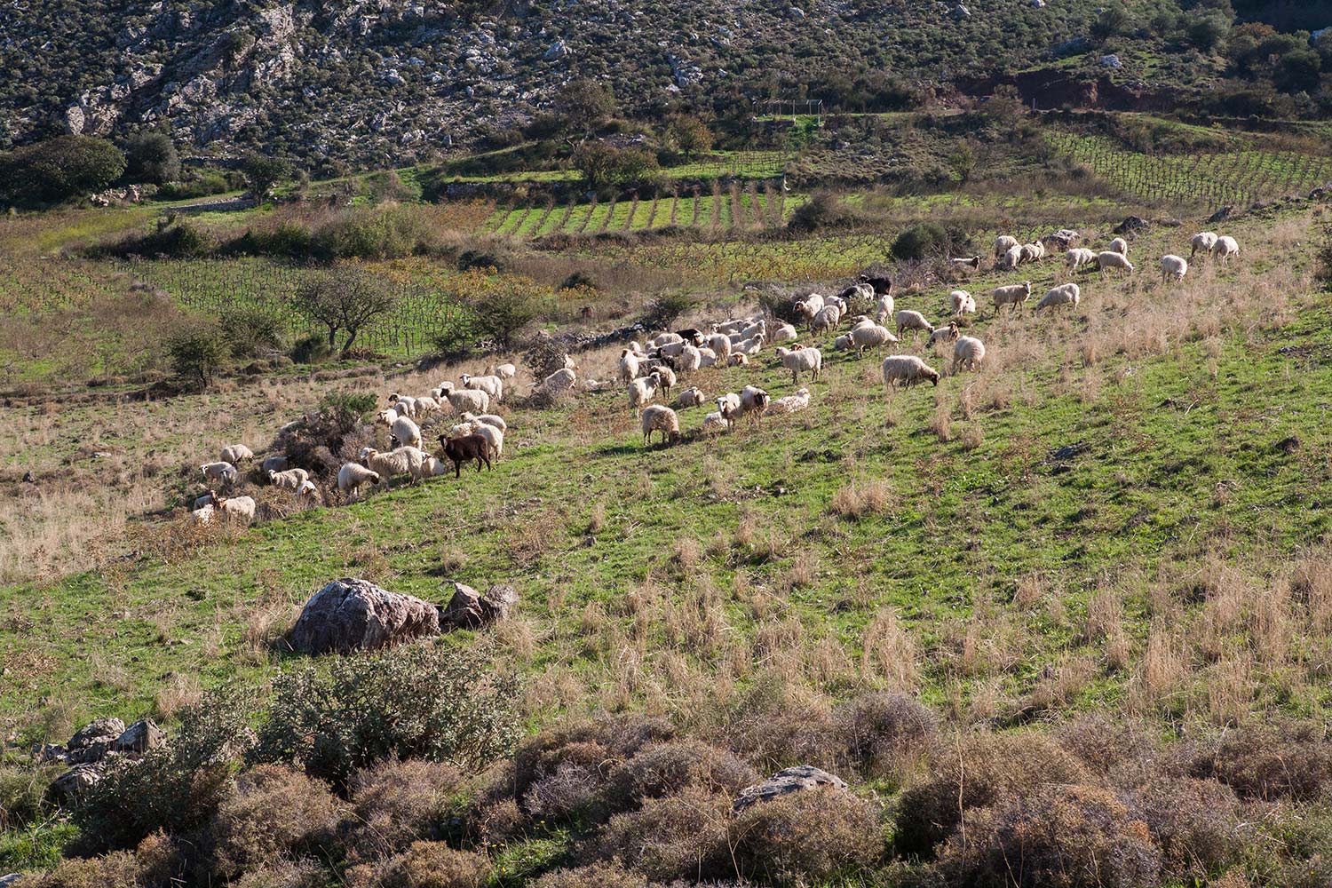 There is a large network of Byzantine chapels inside and outside the village that are restored and are open and accessible to the public. In the wider region of Meronas there are approximately twenty caves, among the most important of them is Mygiospilio. According to a legend, in this cave Kourites, Zeus’ sleepless guards on Mt. Psiloritis, performed their rituals. The narrow lanes and cobblestones from another era lead to the neighborhoods of the village, and the housewives hanging the whitewashed laundry outside in their flower-filled courtyards. The 100 habitants of Meronas are breeders-shepherds and mostly farmers; they plant their fertile fields with seasonal vegetables and fruits in the summer, they pick the olives in wintertime and their cherries at the beginning of summer. In Autumn, after the grape harvest, they follow a special century-old procedure of making the renowned Cretan rakí, a procedure that remains unaltered through time: the Cauldron feasts (called kazanemataor kazania), celebrating the arrival of winter.