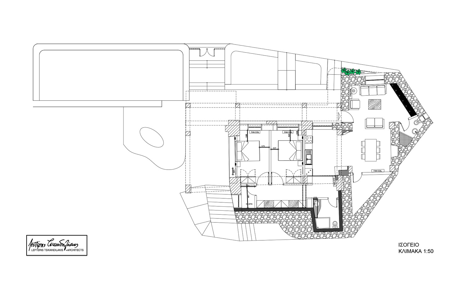 The ‘atrium’ between the villa and the rock offers an absolute privacy. Here lies a path that is carved by time giving a mysterious vibe as it ends up inside the rock. There is also a small “natural living room”, also carved into the rock that give a unique and idyllic atmosphere to the place.