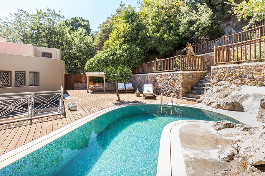 The original house was built in 1935; the choice of location was made taking into consideration its protection from the weather phenomena, its panoramic mountain views, and the proximity to the centre; at the same time it is in an extremely quiet location, as it is located at the edge of the village. The house was originally built of stone, from the quarry that belongs to the craftsman from Meronas – which still exists and is open to visitors – and which was carved for this purpose. The strong material of the stone is highlighted and reinforced so as to integrate the villa into its rocky surroundings. New arched openings from stone were built with a reference to the traditional Cretan architecture. The selection of materials, textures and colours give a sense of harmony between the new and the old as well as the natural landscape.